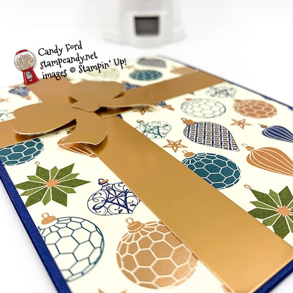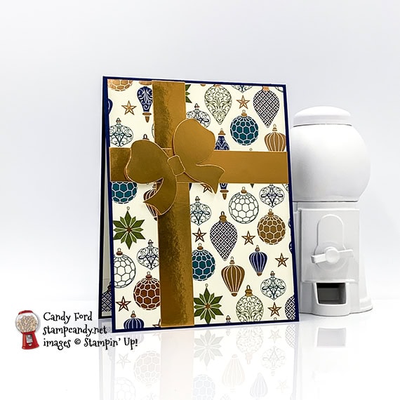 - punched bow adhered over the intersection of the foil strips using Stampin’ Dimensionals