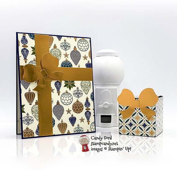 Welcome to the November 2020 OSAT Blog Hop! This month’s theme is Glad Tidings We Bring, so we’re featuring Christmas projects. I used the Gift Wrapped Bundle (Gift Wrapped stamp set ad Gift Bow Builder Punch) and Brightly Gleaming Designer Series Paper to create a Christmas card and Tiny Treat/Gift Box.