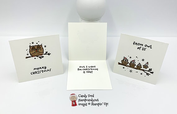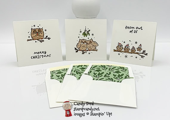 I used the Have a Hoot stamp set and Watercolor Pencils to make these cute little 3″ x 3″ cards, and I used the Envelopes Dies and ‘Tis the Season Designer Series Paper to line the 3″ x 3″ Envelopes. Aren’t these little owls adorable? One is holding a gift, a couple are snuggled up under mistletoe, and a group is celebrating together.