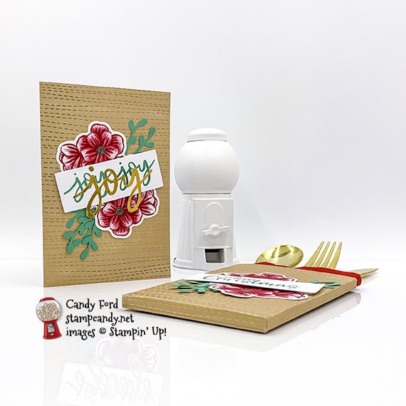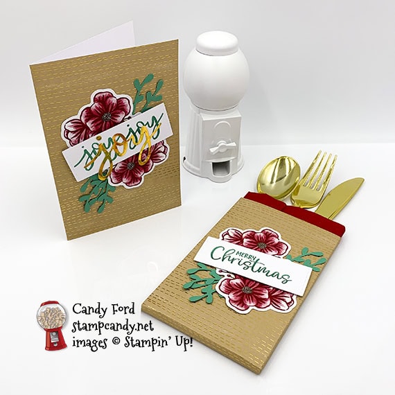 Welcome to the October 2020 PPP Blog Hop! This month’s kit is called Joy to the World and it makes lovely holiday cards in two designs. I used the kit to make a card and a flatware/napkin holder for a holiday table setting. I used the Sprig Punch to add some greenery to the die cut flowers that come with the kit.