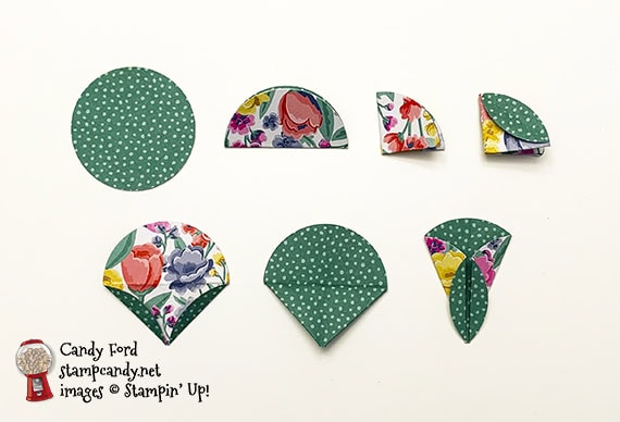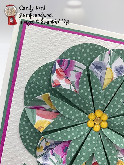 - tips of DSP petals glued onto the Whisper White CS circle, side by side, with the points touching in the center, to create the flower
