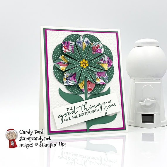 I made this Origami flower card using the Tasteful Touches stamp set, Tasteful Textile 3D Embossing Folder, Tulip Builder Punch, and Flowers for Every Season Designer Series Paper. Last week I hosted another Mystery Stamping Party on Facebook, and this is was my example. I enjoy these parties. I post clues that folks follow to create the mystery project, then everyone posts a photo of their project. It’s wonderful to see all the creative ways people interpret the clues. You can go ahead and join the Facebook group now to see what we do. Then you can participate in the next party on Wednesday, December 2 at 8:00 PM (ET.)