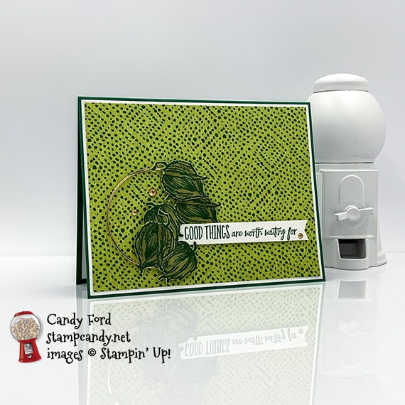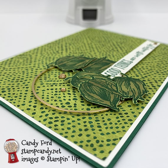 Today’s card features the Enjoy the Moment stamp set, which will be in the January – June 2021 Mini Catalog. I also used the Forever Greenery Designer Series Paper and Banners Pick a Punch along with the Gold Hoop Embellishments and Champagne Rhinestone Basic Jewels.