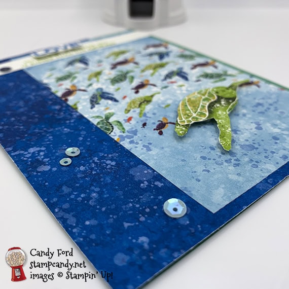 - large turtle adhered onto the smaller DSP layer using Stampin’ Dimensionals