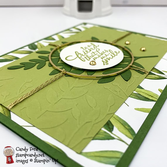 Today’s card is yet another sneak peek at products from the 2020-2021 Annual catalog, specifically the Forever Greenery Suite. I used the Forever Fern Bundle (Forever Fern stamp set and Forever Flourishing Dies,) Forever Greenery Designer Series Paper, Greenery Embossing Folders, Forever Greenery Trim Combo Pack, and Gold Hoop Embellishments.