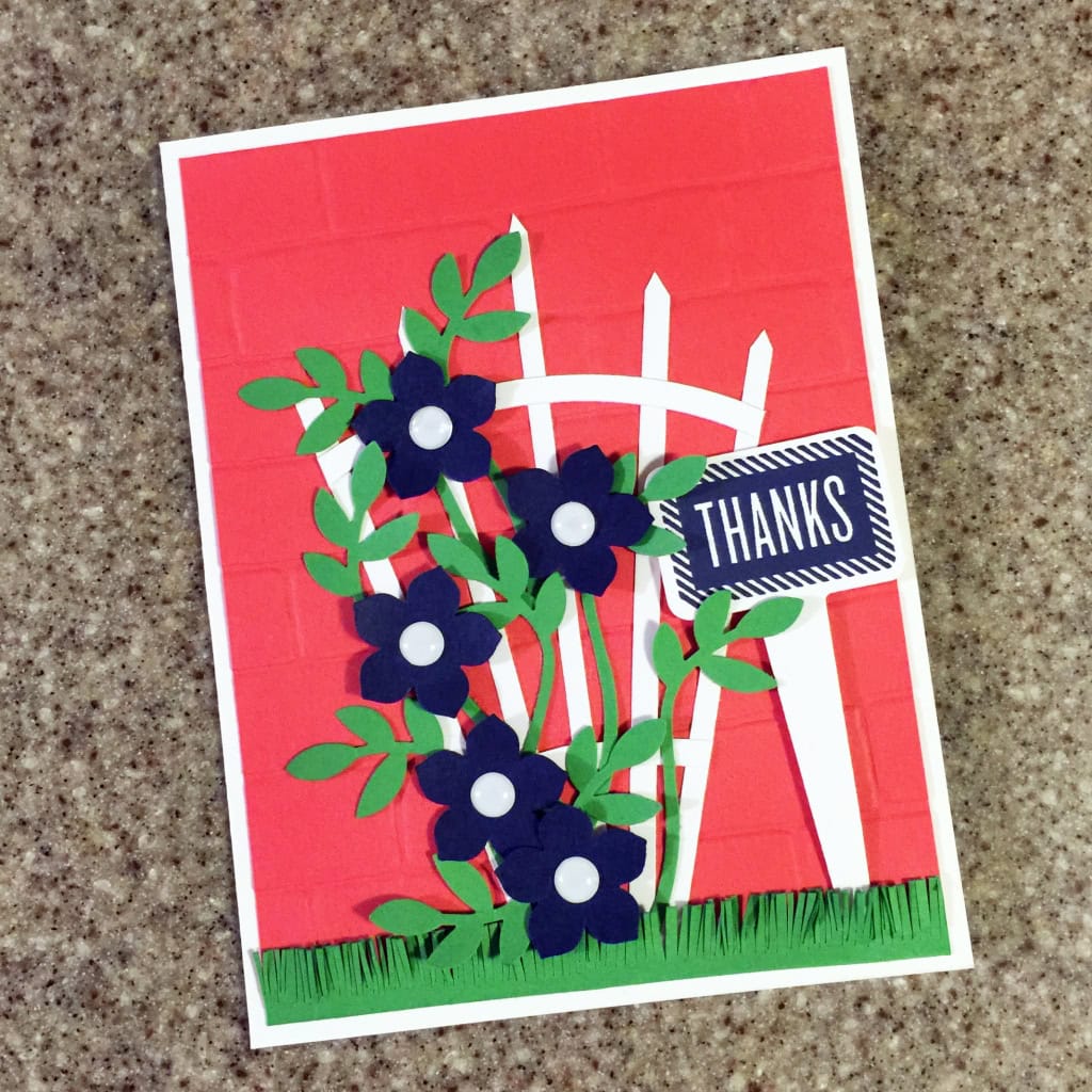 The card base is the new Thick Whisper White card stock. The trellis and sign are cut from the regular Whisper White card stock. The sign image, from the new Stake Your Claim stamp set, is stamped in Night of Navy, and it’s cut with the Handpicked Framelits Dies. I used my Stampin’ Trimmer to cut 1/8″ strips for the trellis. I cut the two cross pieces with the Ovals Collection Framelits Dies.