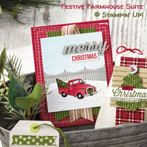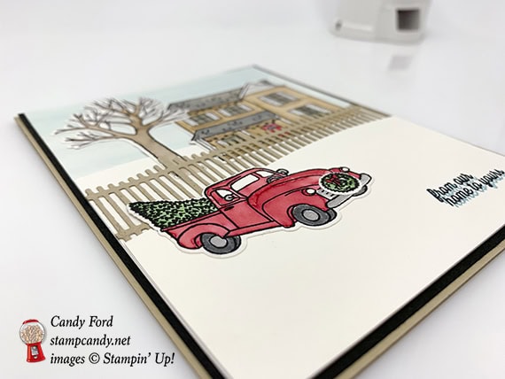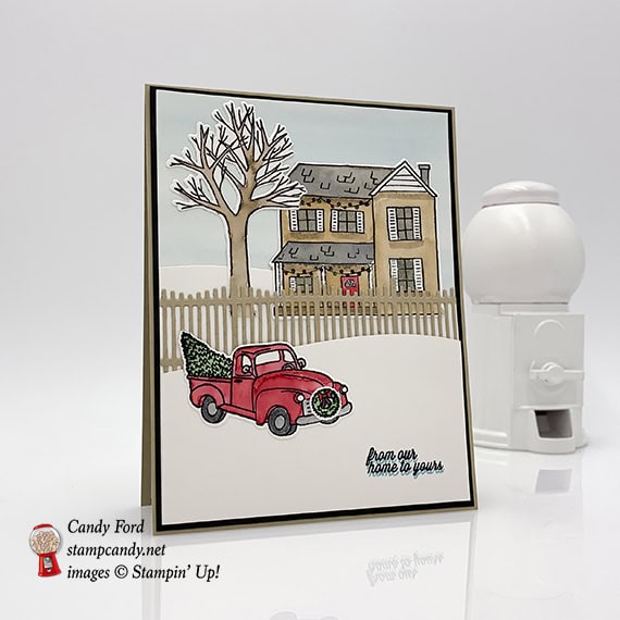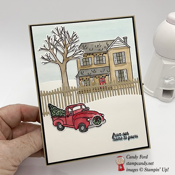 I made today’s card using the Farmhouse Christmas bundle (Farmhouse Christmas stamp set and Farmhouse Framelits Dies). I used several layers of Shimmery White card stock (CS) to create the snowy scene, and used an Aqua Painter to color the die cut pieces. I got the idea from a card on page 12 of the 2018 Holiday Catalog. They used the truck and the fence, and some Embossing Paste for snow.