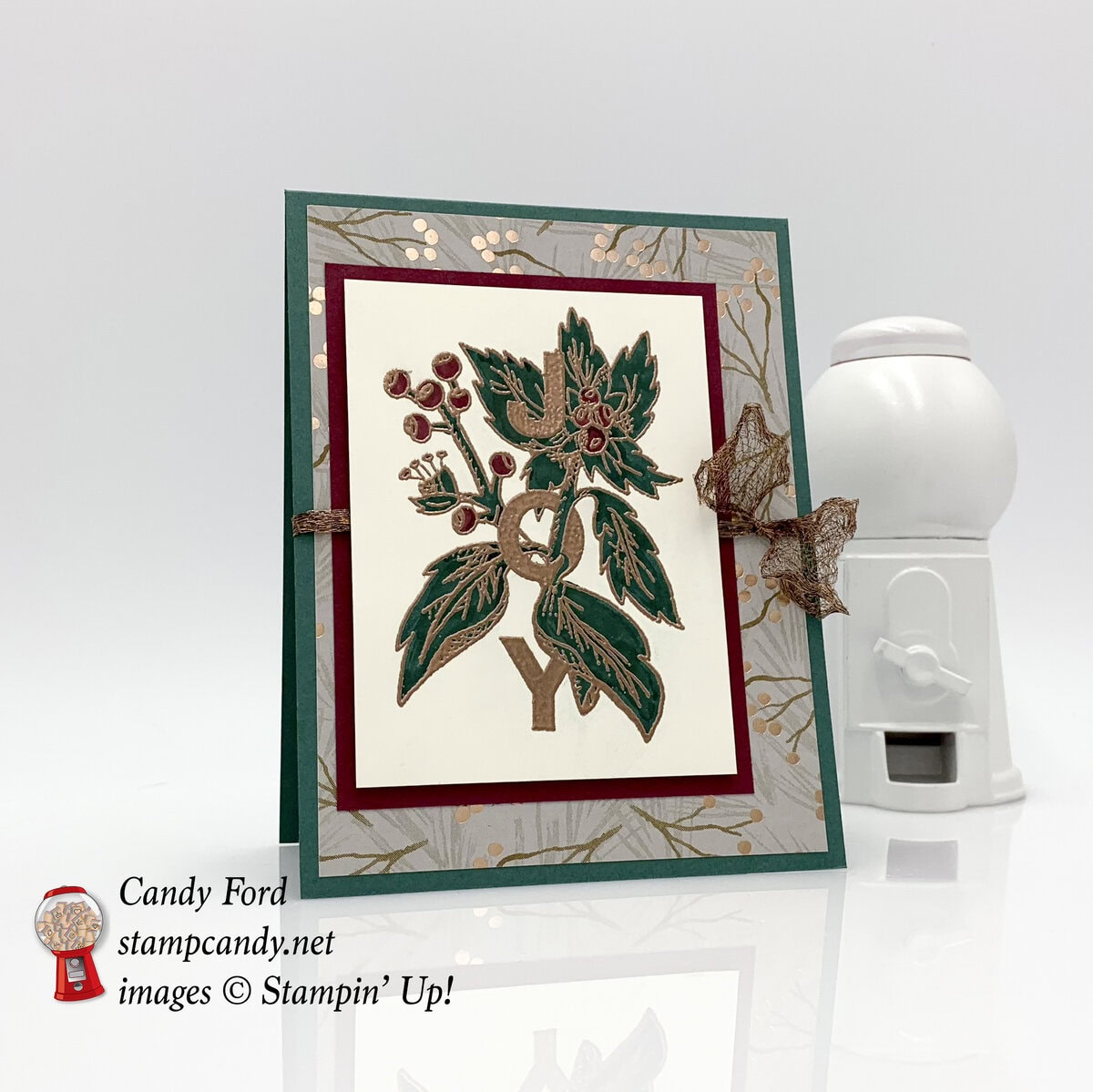 For today’s Christmas card, I heat embossed an image from the Joy & Noel stamp set in copper, then colored it in with Stampin’ Write Markers. I paired it with the Joyous Noel Designer Series Paper, which has copper highlights, and card stock in Tranquil Tide and Merry Merlot. Copper Trim is the final touch – I stretched the loose ends so it looks almost like a bow.