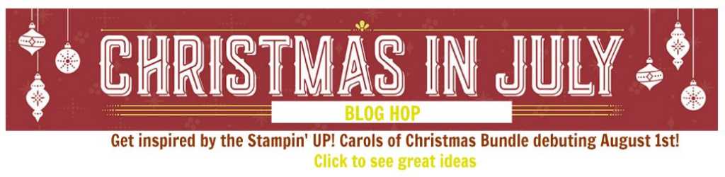 Today’s card, for the Christmas in July Blog Hop, features the Carols of Christmas stamp set, which you can order beginning Tuesday! You can even get it bundled with the Card Front Builder Thinlits Dies to save 10%! Today’s card also features a sneak peek at a couple of brand new items from the 2017 Holiday Catalog: Merry Little Christmas Designer Series Paper and Green Sprigs.