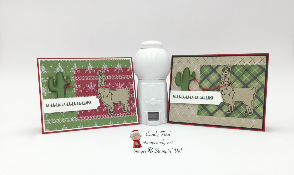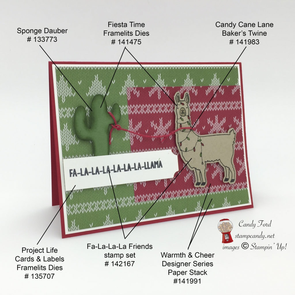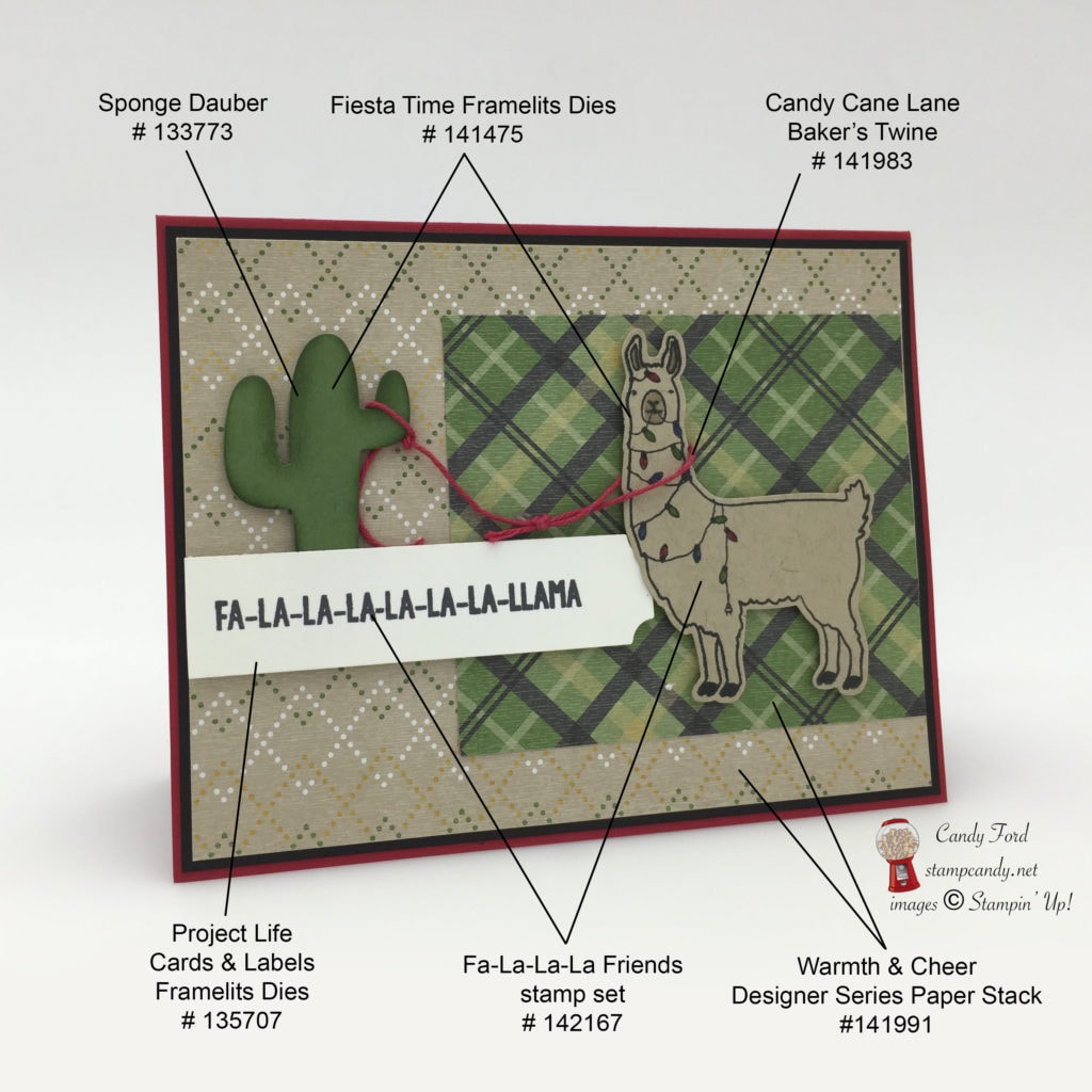 I stamped the llamas from the Fa-la-la-la Friends stamp set in Memento Black ink onto Crumb Cake CS and cut them out with another die from the Fiesta Time Framelits. I used Stampin’ Write Markers in Cucumber Crush, Real Read, and Pacific Point to color in the lights.
