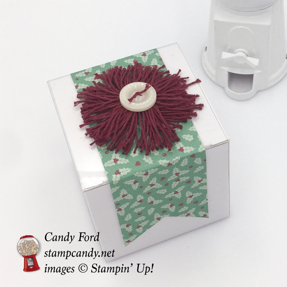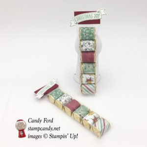 I attached the mantle to the brick wall with Stampin’ Dimensionals. I attached the stockings to the brick wall with Stampin’ Dimensionals, and to the mantle with glue.