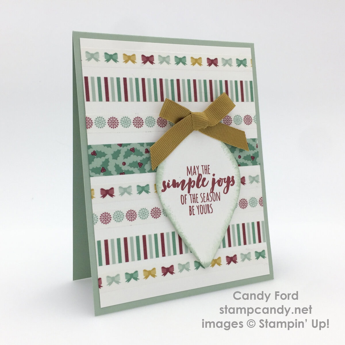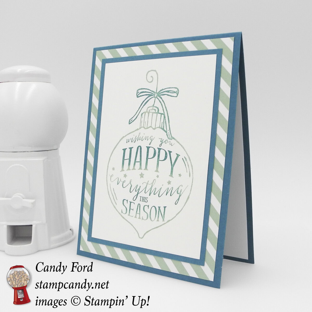 The Happy Ornament wood mount stamp is retiring soon, so get it while you can! I used it to create this card with a palette of cool colors. This is a really quick card to make. There’s only one stamp and the rest is gluing together some layers.