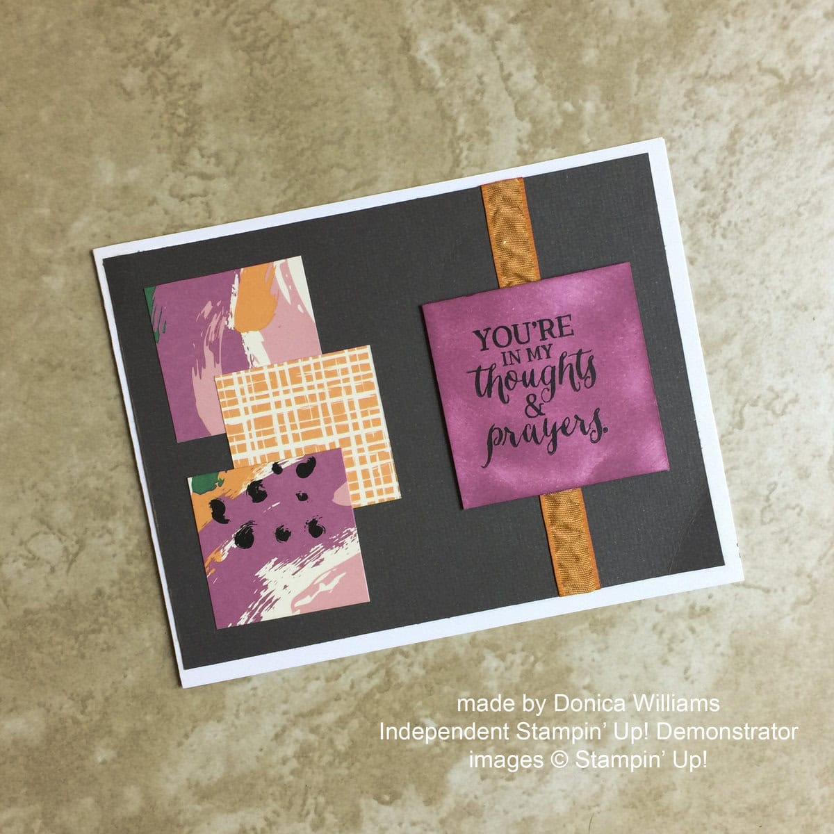 I am in love with the Painted Harvest Suite of products on pages 48-49 of the 2017 Holiday Catalog. The two step images in this stamp set are sooooo easy to do. And the Painted Autumn Designer Series Paper (DSP) is gorgeous – it has 10 colors in it so you can use it with lots of different projects. I used some of the products in the suite for today’s card, which I made for this week’s Global Design Project color challenge (GDP105.)