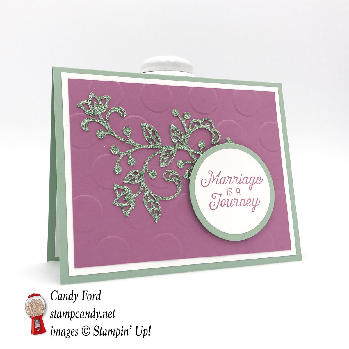 I heat embossed the sentiment in white onto Sweet Sugarplum card stock, then I cut it out with a die from the Layering Ovals Framelits. I glued that onto the card front.