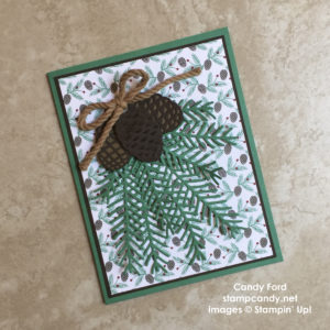 I used the Pretty Pines Thinlits to cut the pine boughs and the pinecone backs and fronts.