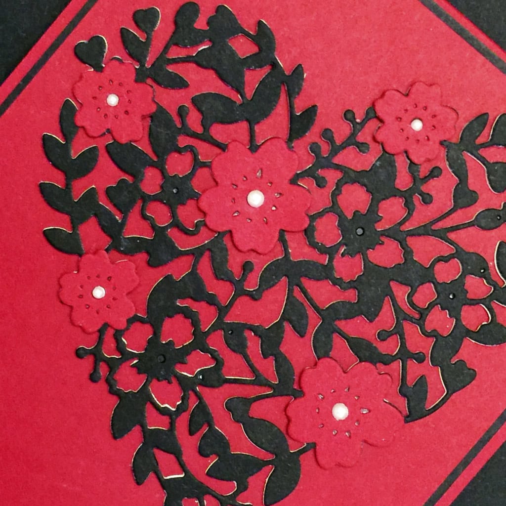I cut one heart, 2 larger flowers, and 3 smaller flowers, using the Bloomin’ Hearts Thinlits Dies. This heart is a very intricate die. I highly recommend using the Precision Base Plate with the Magnetic Platform, and running it back and forth through the Big Shot a few times…