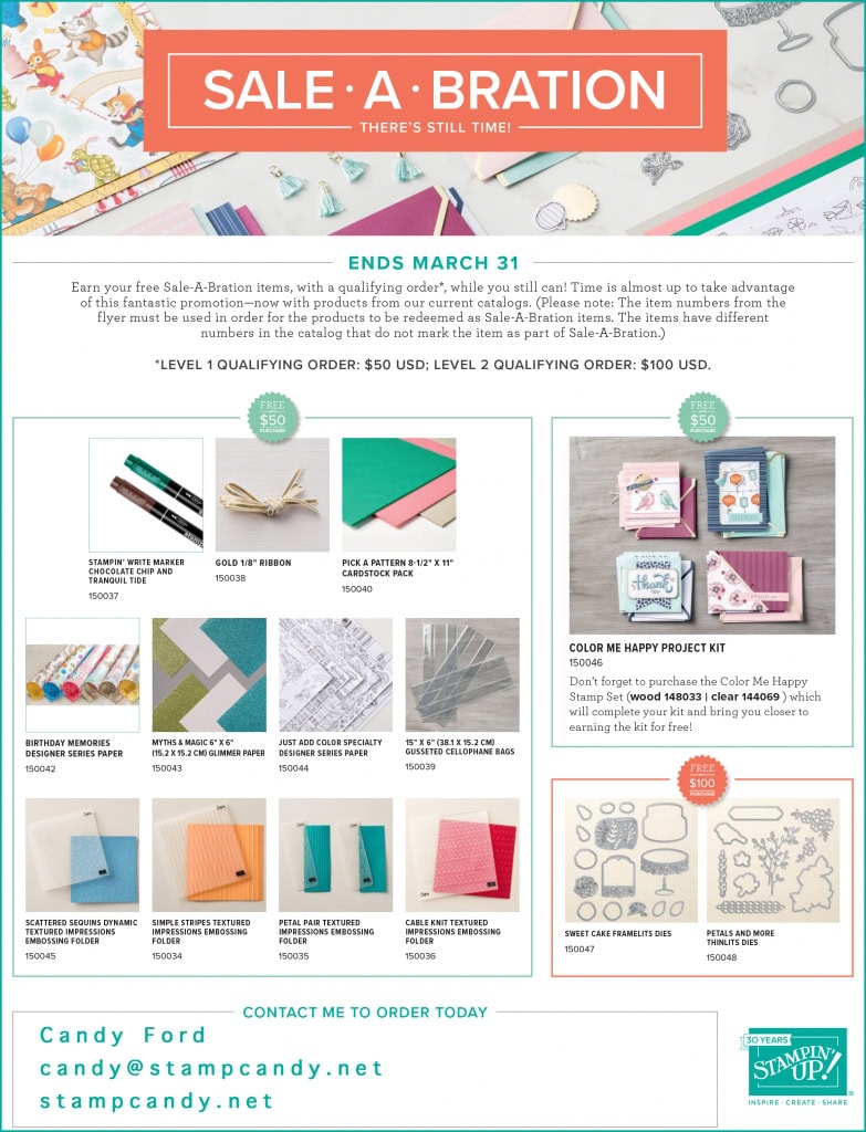 Stampin’ Up! has released even MORE Sale-A-Bration (SAB) items! The products in this 3rd release are from the catalogs, and they’ve been given new item numbers for SAB. There are 12 new Level 1 items, available for free with a $50 order, and there are 2 new Level 2 items, available with a $100 order. You can still order them with their original item numbers, but to get them FREE you must use the item numbers on the flyer below. SAB ends March 31, 2018. Don’t wait til the last minute – what you want might be sold out!