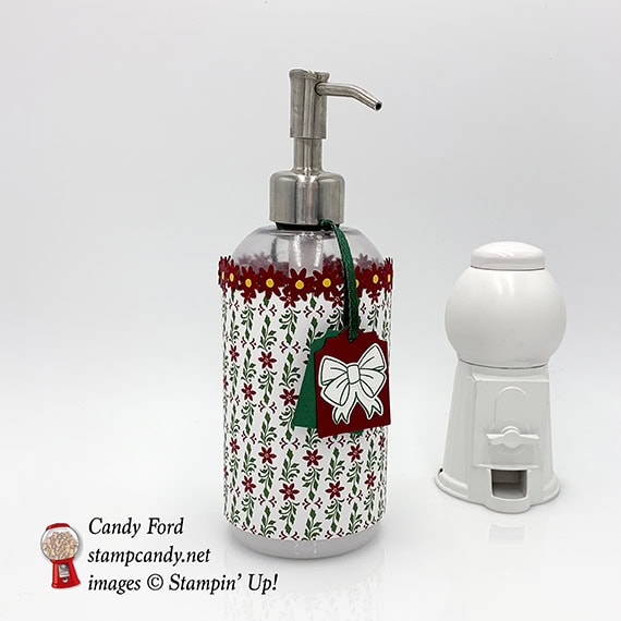 Need a really last minute gift? Wrap something ordinary, like a plain soap / lotion dispenser, in decorative paper and add a few embellishments, and you have a lovely and sensible gift that anyone can use. I used Dashing Along Designer Series Paper to wrap the dispenser. I used a new punch from the 2019 Occasions catalog (Bitty Blooms Punch Pack sneak peek!) for the little flowers around the top. The bow on the tag is from the Bring on the Presents bundle.