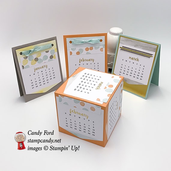 It’s time for the last A Paper Pumpkin Thing Blog Hop of the year! The December kit is called Day By Day and if featured a cute little calendar and a gift box it fits in. For my alternate projects I used some of the calendars to make birthday cards and some to make a calendar cube. I’ll send the cards to someone with a birthday or anniversary that month, and I’ll circle the date on the calendar – there’s a handy little circle stamp in the set just for this purpose! I’ve left the insides blank for now so I can stamp the appropriate sentiment in them later. I haven’t lined these yet either, but I’ll glue a piece of Whisper White card stock inside each one for the sentiment and handwritten note.