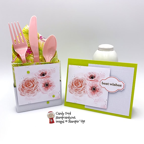 A flatware/napkin holder and a card for a wedding shower. Since these were the only napkins I had with pink in them, I took the color (Lemon Lime Twist) from them for the projects. The Lemon Lime Twist card base and the Gingham Gala Adhesive Backed sequins are the only things you see that didn’t come in the kit. (I put the sequins on the box, but forgot to put them on the card before I took the photo. Oops!)