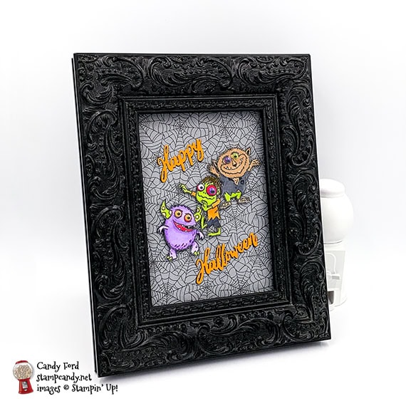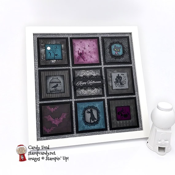Welcome to the Home Decor SU Style Blog Hop October 2020! This month we’re featuring home decor items you can give as a gift. I made a framed Halloween sampler featuring the Ghoulish Goodies stamp set and the Magic in This Night Designer Series Paper, along with Everything Essential stamp set, Hallows Night Magic stamp set, Ornate Frames Dies, and Halloween Magic Dies. While I thought I ordered a black 12×12 frame, a white one came instead. I didn’t have time to get another one, so please try to imagine this in a black frame. Thanks!