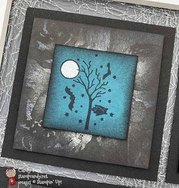 I don’t know why I thought this was a tree, when it is clearly a branch with a bat hanging from it. I’m going to try to pull this piece off and rotate it 90 degrees, but I was afraid to try it before I took the photos. By the way, I love how the metallic Mesh Ribbon over the Basic Gray background looks like cobwebs.