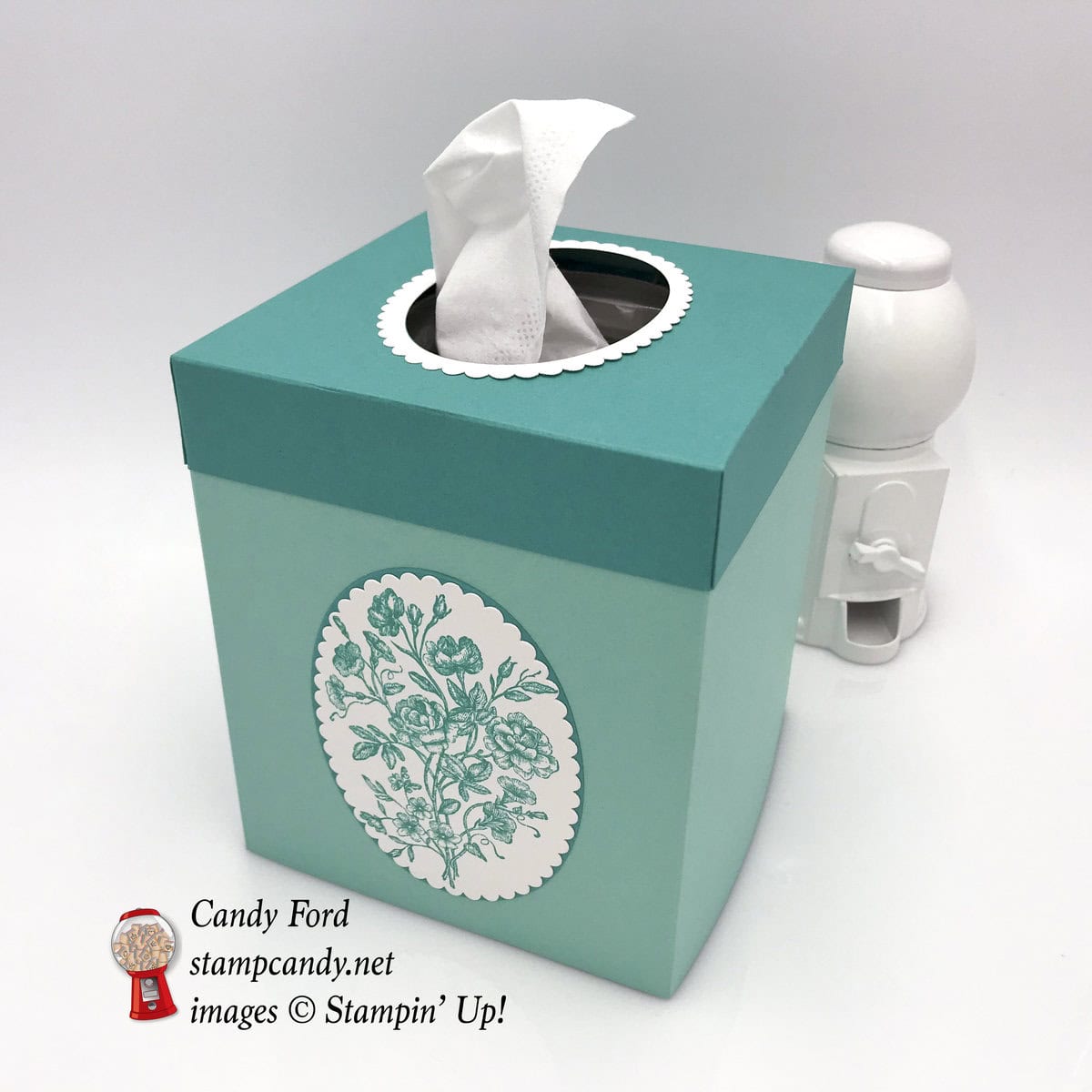 I can’t seem to get enough of the Very Vintage host stamp set. Especially the large floral image I’ve used today…..and the last few days. At least today’s project is a little different in that it isn’t even a card. It’s a tissue box cover. I like to make at least one whenever a new catalog comes out.