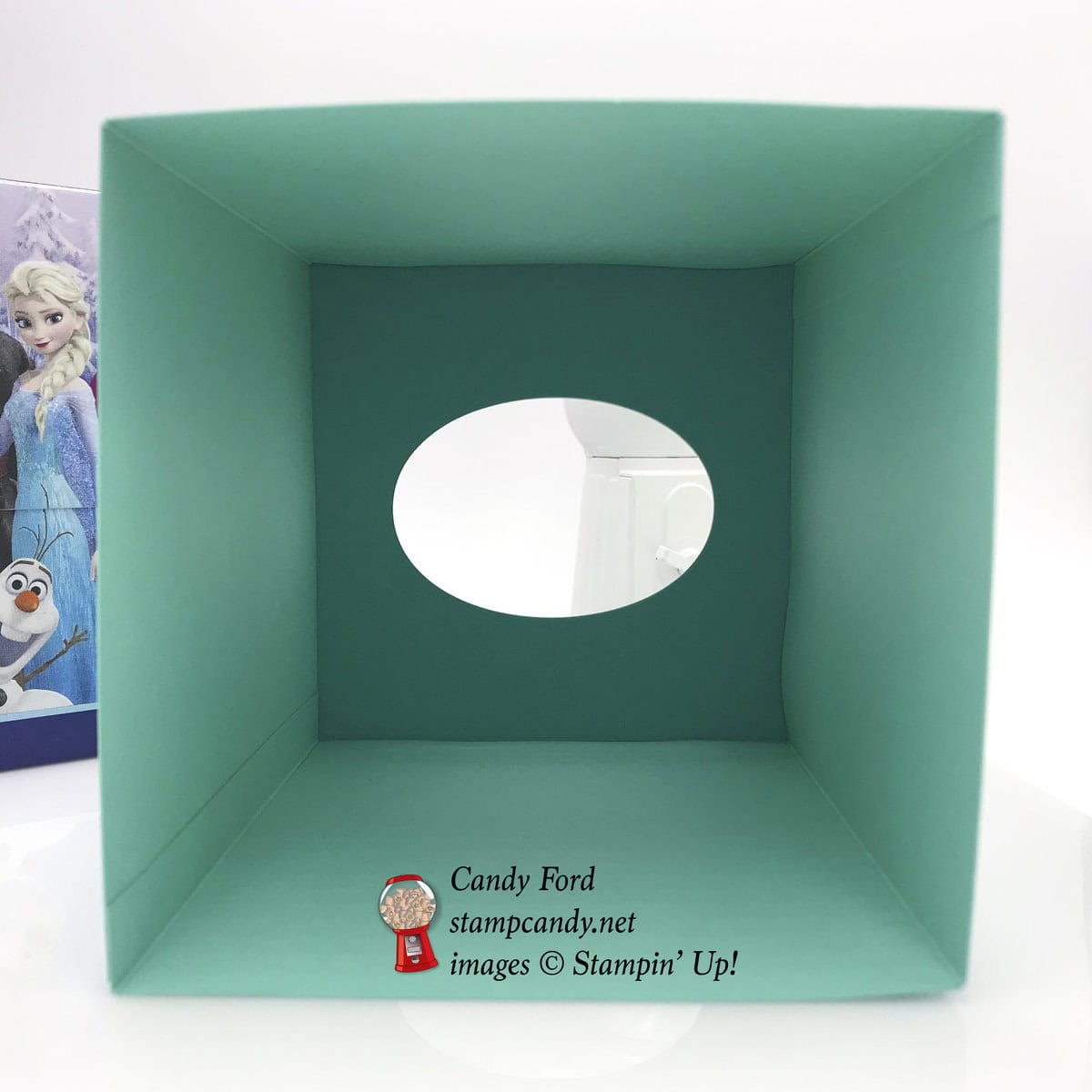 cut a hole in the center of the 8-1/2″ x 8-1/2″ piece of DSP with the smallest of the three dies