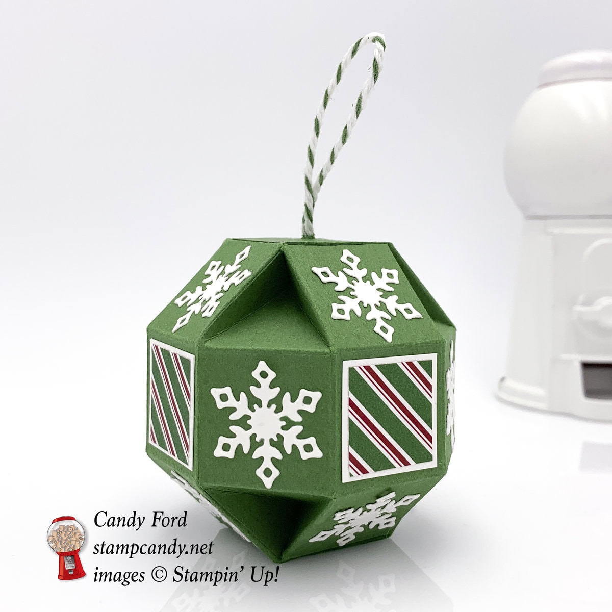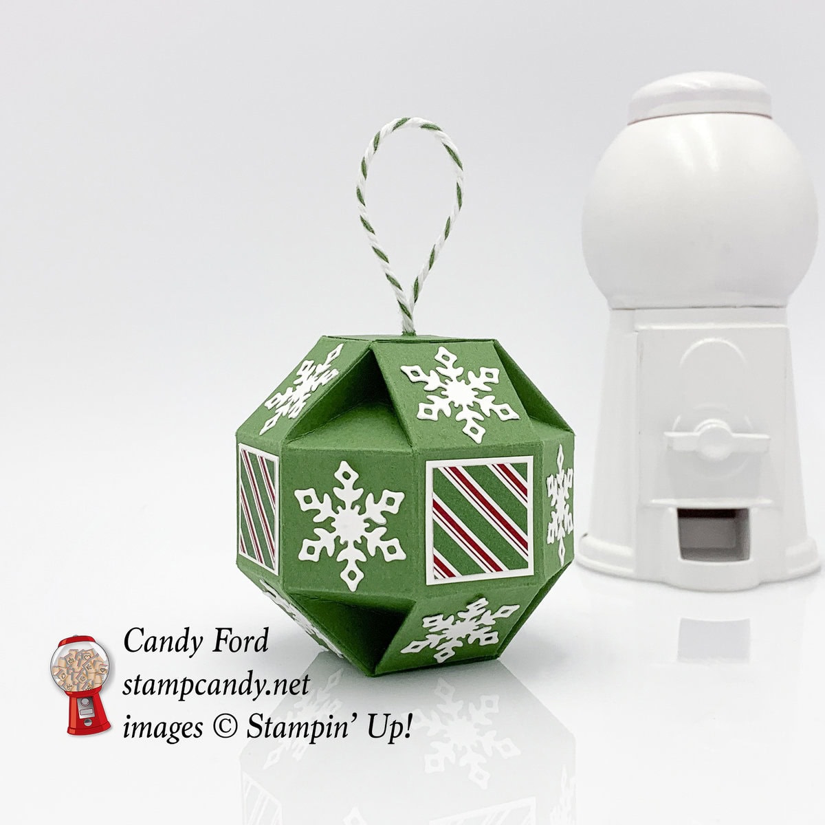 Recently I saw a video for a die that cut out the parts for this ornament, but I thought I could do it myself. So I did! It looks much more complicated than it is. It’s just one piece of paper scored and folded, with a few pieces cut away. Add a piece of twine or ribbon and some glue and you’re done! I used the Dashing Along Designer Series Paper (DSP) and the Snowfall Thinlits Dies to decorate the ornament. By the way, the Dashing Along DSP was a limited time offer that expired, but it’s back while supplies last!!!