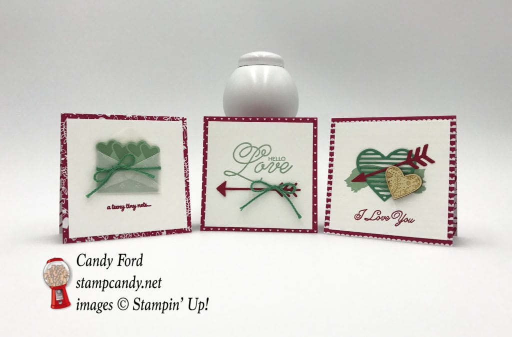 Each card is half a piece of Sending Love DSP, folded in half to make a 3″ x 3″ card.