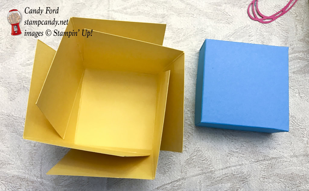 These are by far the fastest and easiest gift boxes I know how to make, and I make them all the time in various sizes. I made these for members of my team, the Candy Hearts, who attended OnStage (Stampin’ Up!’s semiannual convention type event) last weekend. In each box I put a pair of earrings with photos of candy conversation hearts on them. I didn’t use a single stamp on these boxes. Instead I used dies from the May Flowers Framelits, Sunshine Wishes Thinlits, and Large Letters Framelits.