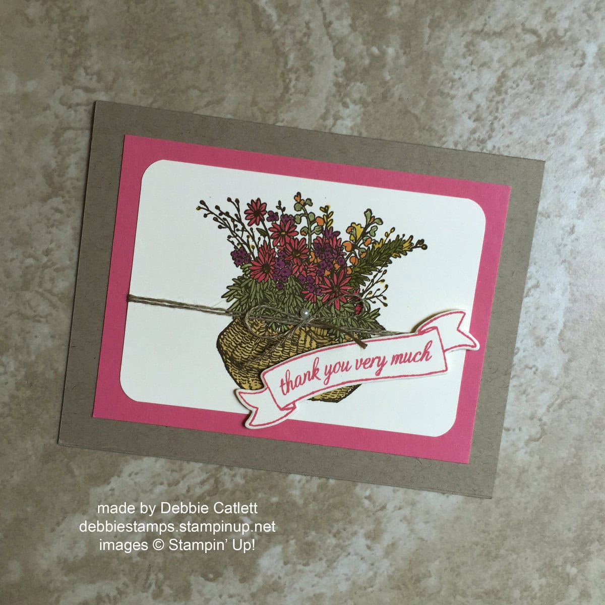 Debbie used the Basket for You stamp set, Bunch of Banners Framelits, Linen Thread, card stock (Crumb Cake, Melon Mambo, Whisper White,) Melon Mambo ink, Stampin’ Write Markers, and a Pearl Basic Accent.