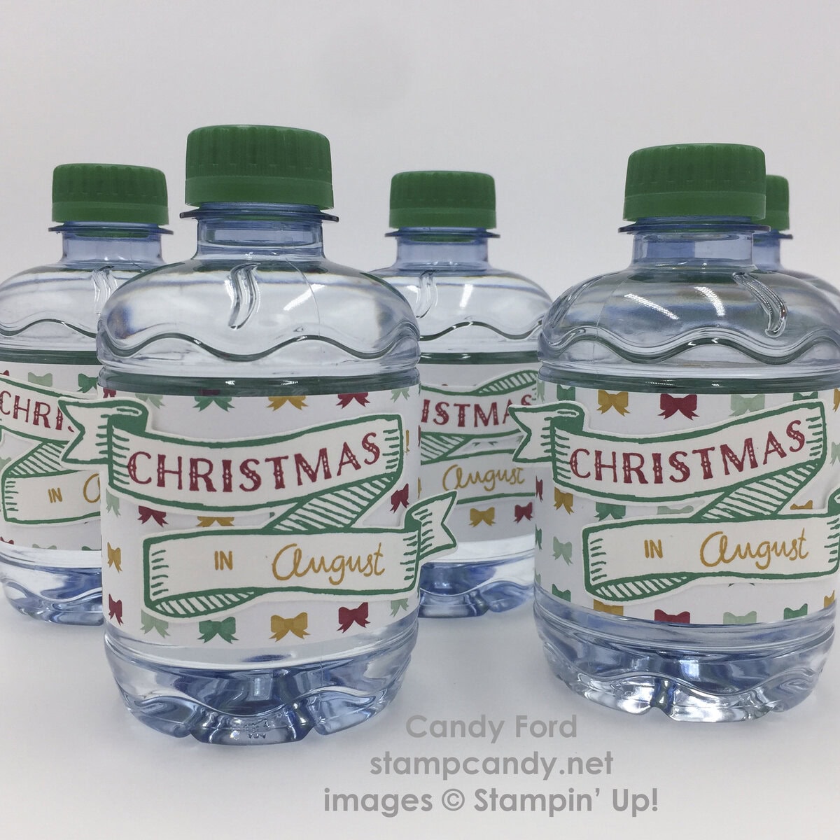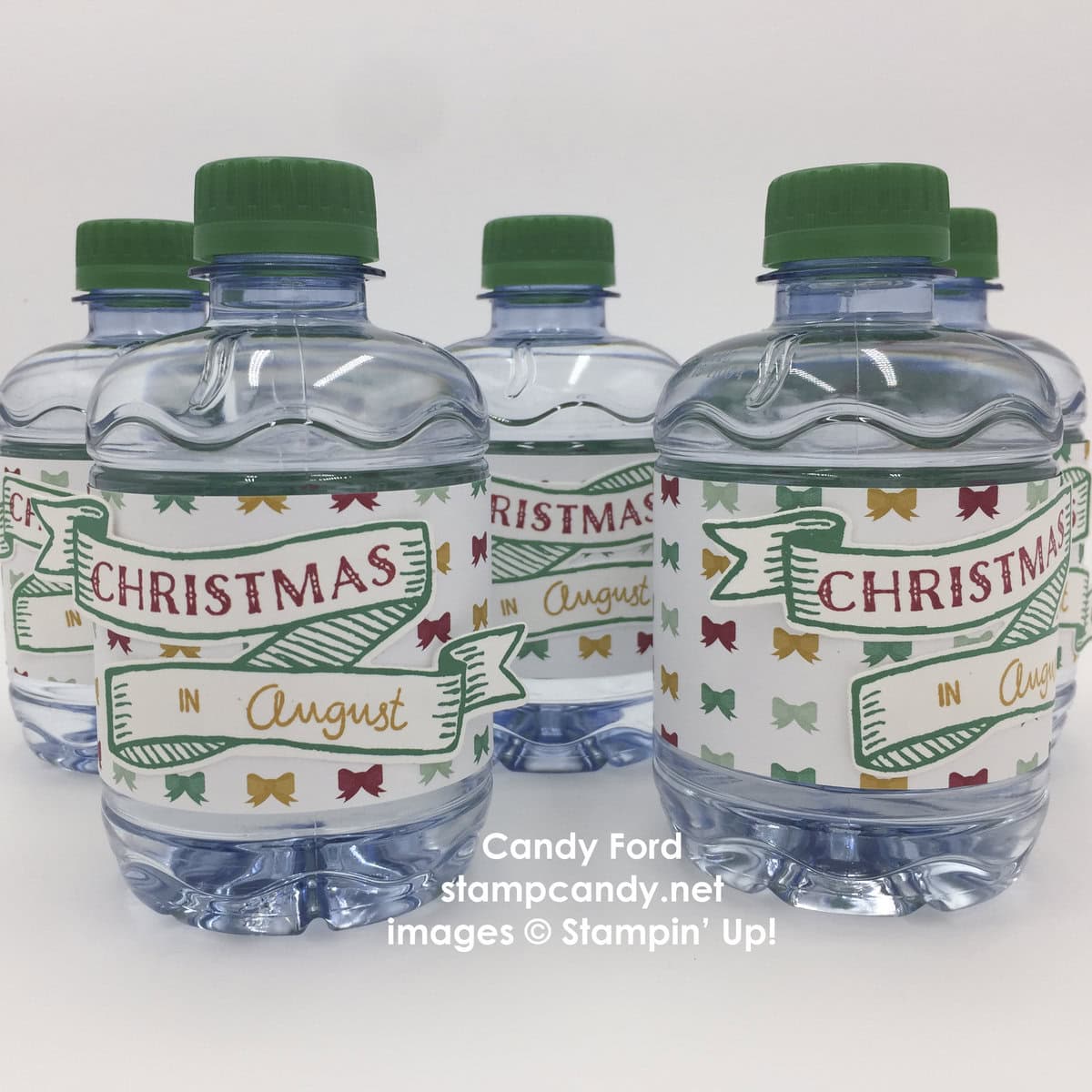 I always decorate bottles of water for my classes, not only because attendees need to stay hydrated, but mostly to let them know how special I think they are, and how much I appreciate them. My Christmas in August card class was this Sunday, and I thought I would share those bottles with you today.
