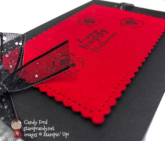 - card sentiment and 3 spiders in Tuxedo Black Memento ink onto a scrap of Real Red CS