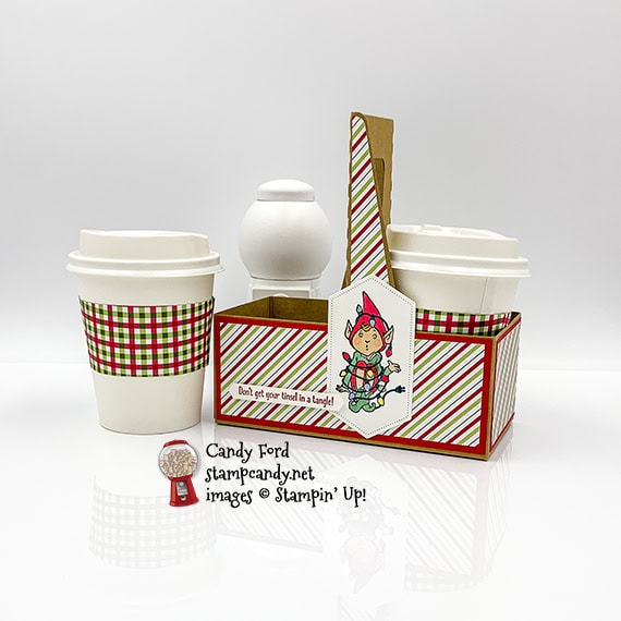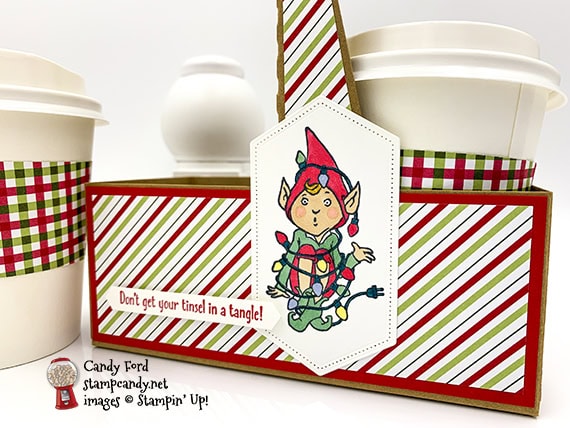 I used the Don’t Stop Believin’ stamp set and Heartwarming Hugs Designer Series Paper to decorate these Mini Coffee Cups and Mini Coffee Holder. This is a great way to give a gift of hot cocoa, K-Cups, or any small gifts. I think this elf all tangled up on Christmas lights is adorable. Actually, I think everything in this stamp set is adorable. Don’t you?