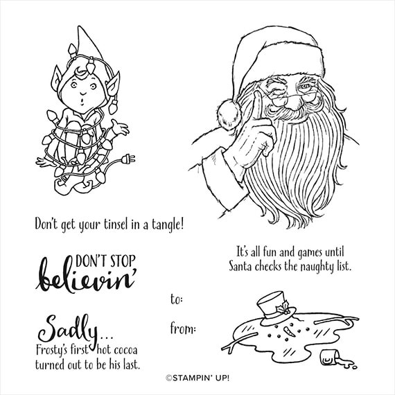 - sentiment adhered using Mini Stampin’ Dimensionals onto the DSP layer and overlapping the elf
