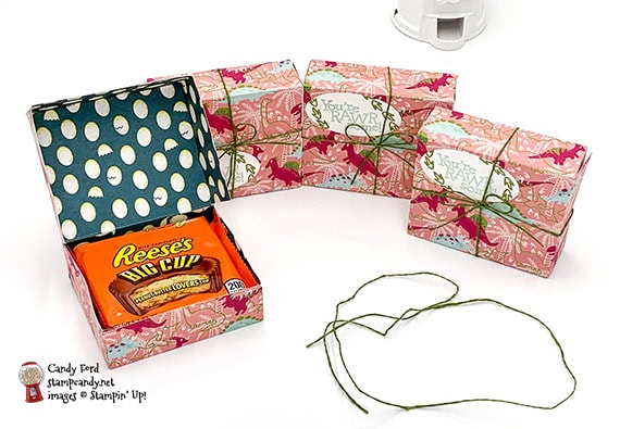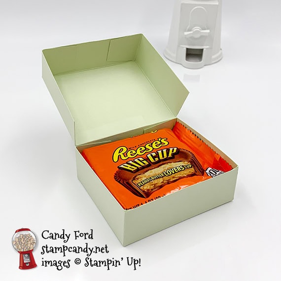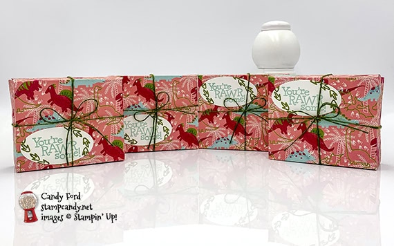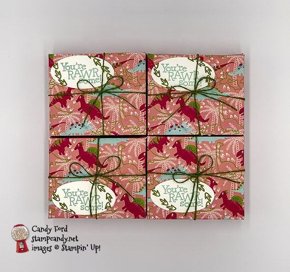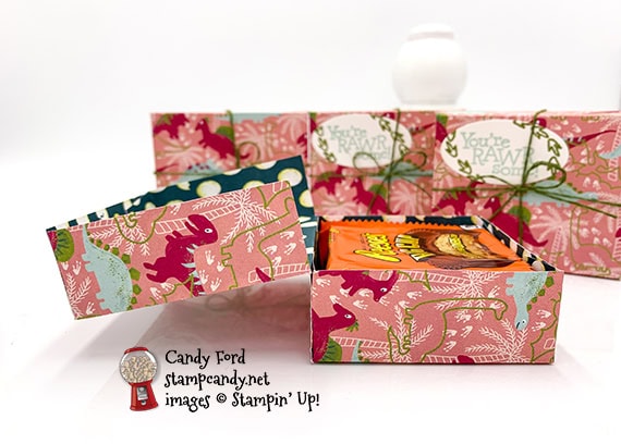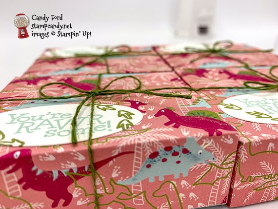 Today I’m sharing some little treat boxes I made with the new Dinoroar Designer Series Paper and the Dino Days stamp set. It’s the same basic box I shared a few days ago – you can see that post here. It holds a Reese’s Big Cup perfectly. I made these for our Candy Hearts team play date. I thought the playful paper pattern was appropriate for the occasion. (And everyone got their treat – I didn’t eat them all before they got there.)
