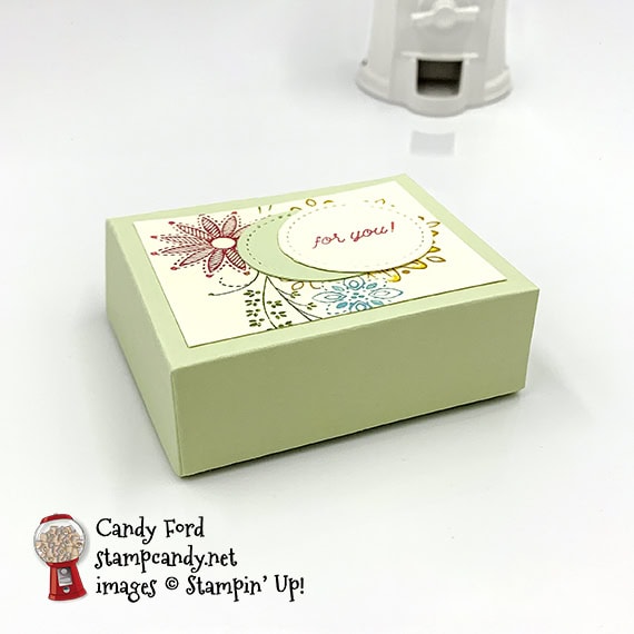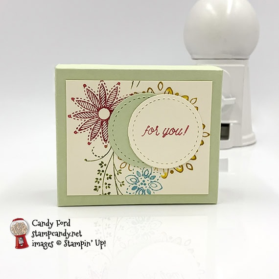 Today is the March Candy Hearts Team Meeting, and I’m sharing with you some little treat boxes I made for the Hearts. Each sliding box holds 5 Andes Mints… because they’re green… for St. Patrick’s Day. I used the Amazing Life stamp set (which contains a clover image,) Call Me Clover (of course) card stock and ink, and Happiness Blooms Designer Series Paper. I used two different patterns of the Designer Series Paper that have a lot of Call Me Clover in them.