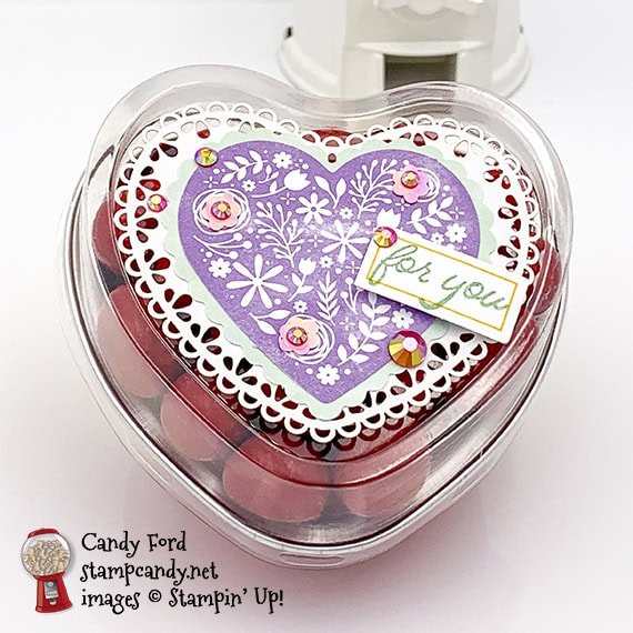 - heart doily adhered onto the clear lid of the tin using Stampin’ Dimensionals