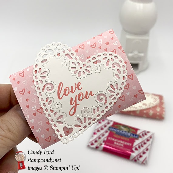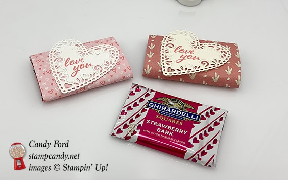 Today I’m sharing an extremely simple little treat holder. It’s basically a piece of Designer Series Paper (DSP) wrapped around a Ghirardelli square, with a die cut heart and stamped sentiment. I made a couple of versions: one with All My Love paper DSP and a Whisper White card stock (CS) heart, and one with Needlepoint Nook DSP and a Very Vanilla CS heart. I stamped the sentiment from the in Flirty Flamingo ink.