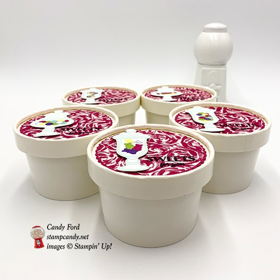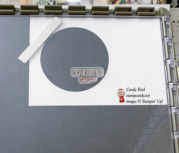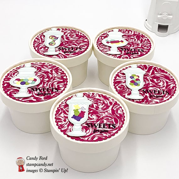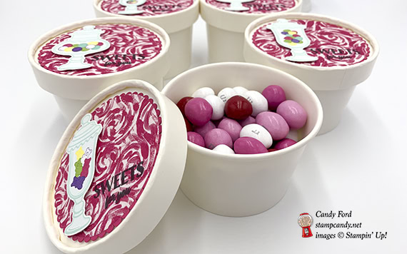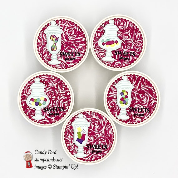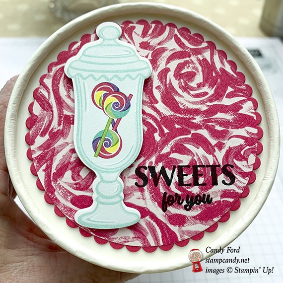 - die cut candy jar adhered onto the DSP circle using Stampin’ Dimensionals