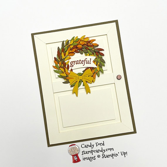 - sentiment adhered in the center of the wreath using a Stampin’ Dimensional, tucking the left end under the leaves