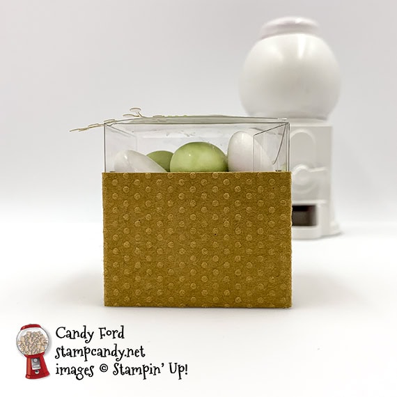 2 pieces of dotted card base wrapped around a treat box and adhered using Tear & Tape