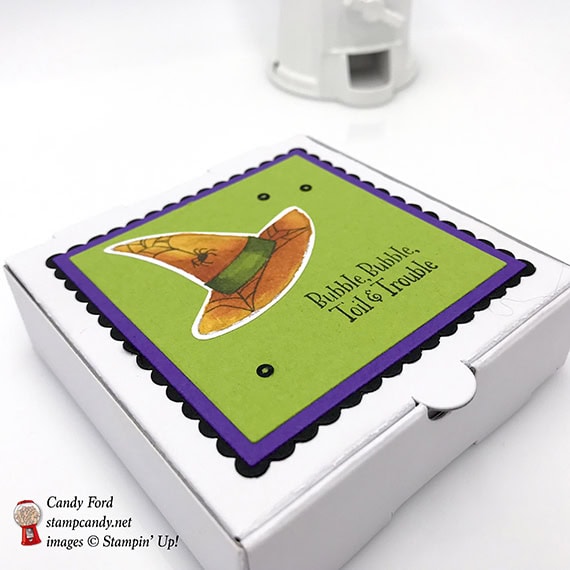 Today’s project is an adorable Halloween treat box made with a Mini Pizza Box, the Layering Squares Framelits Dies, Toil & Trouble Designer Series Paper, and the Cauldron Bubble Bundle. the Cauldron Framelits Die actually cut images from the Toil & Trouble DSP! Easy peasy! The finishing touch on the treat box is 3 sequins from the Black Mini Sequin Trim.
