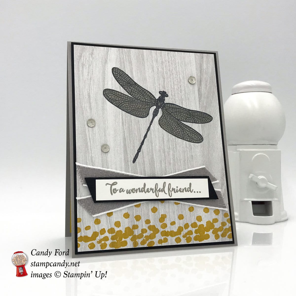 It’s time for the OSAT Blog Hop for August! This month we’re doing a Tic Tac Toe challenge. We must choose three items in a row (horizontally, vertically, or diagonally) and include all three on our projects. I used the Dragonfly Dreams stamp set and Detailed Dragonfly Thinlits Dies to create this card and gift container. The container came with cashews in it. Cashews would make a nice little gift, but since I ate the cashews already (they were honey roasted – how could I not?) I washed out the container and now it’s ready for candies or a small gift.