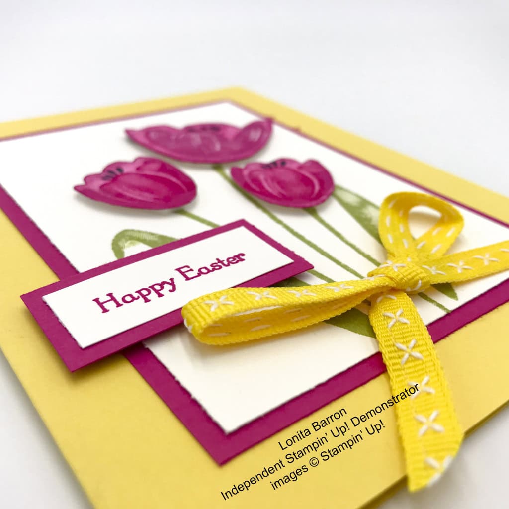 Today I get to share with you a card made by Lonita Barron, one of my Candy Hearts team members, for our February swap. She used the Tranquil Tulips stamp set to create this exquisite Easter Card in Daffodil Delight and Berry Burst.