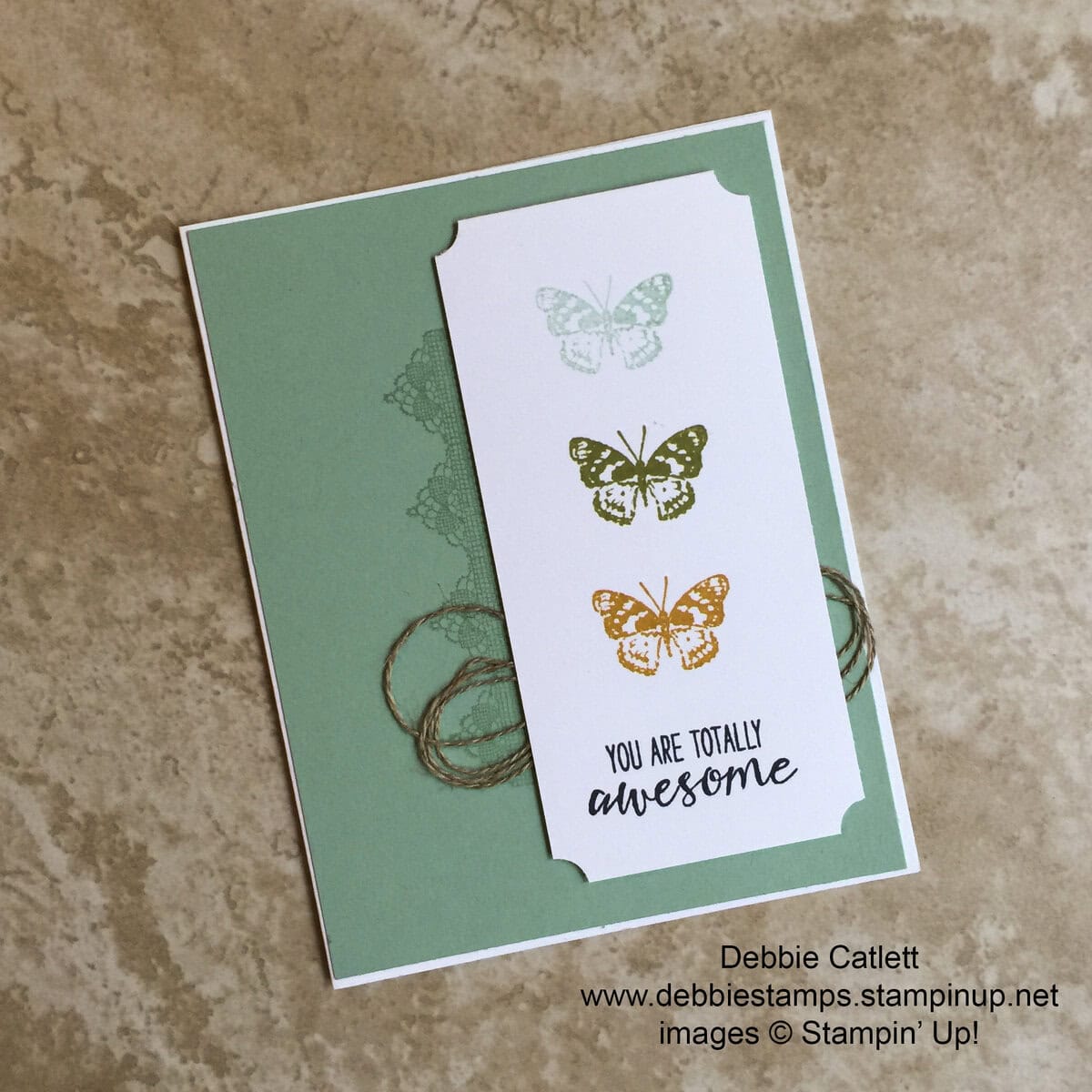 She stamped the butterflies in Mint Macaron, Mossy Meadow, and Delightful Dijon, as well as the sentiment in black, onto Whisper White card stock. I’m not sure how she cut the corners, but I would guess she used a small circle punch, maybe 1/2″ or so. At least, that’s how I would have done it.