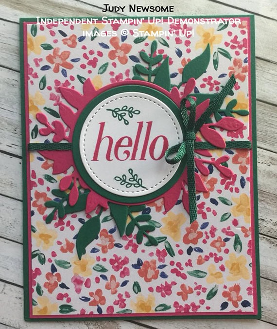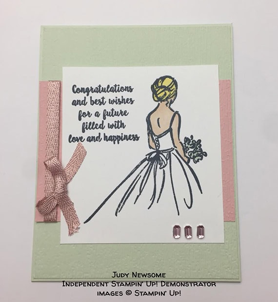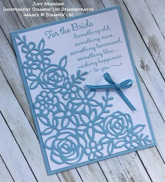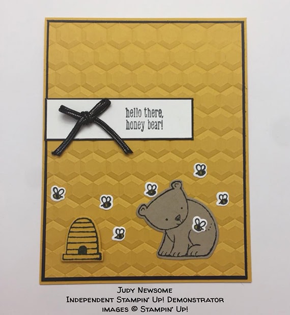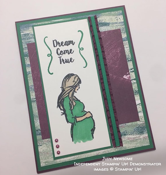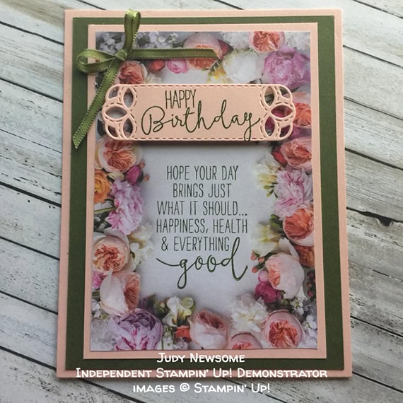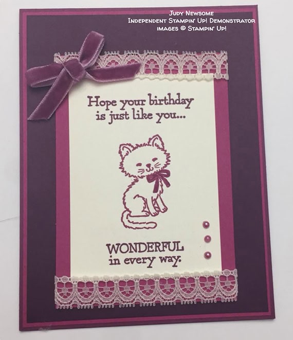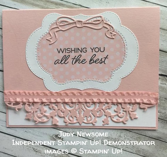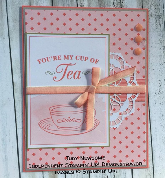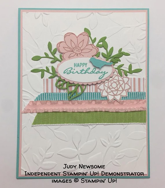 Judy Newsome made all the cards in today’s post. She’s a member of my Candy Hearts team of Demonstrators, and she lives in LaFayette, Georgia. By the way, in Walker County, GA, it’s pronounced la-FAY-it instead of LAH-fay-YET. You may notice that most of Judy’s cards (12 of the 16) have ribbon or twine. She’s an amazing seamstress and her love of fabric and trims spills over into her amazing card making.