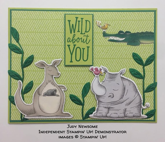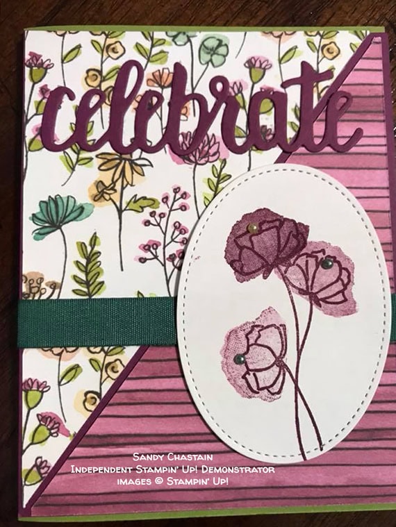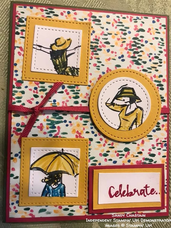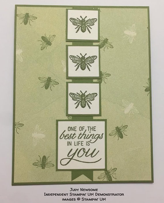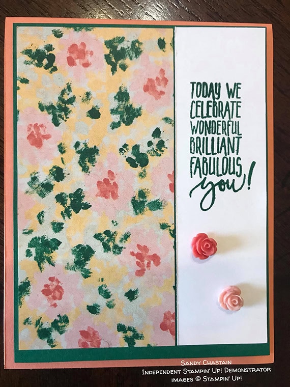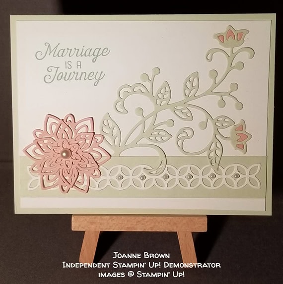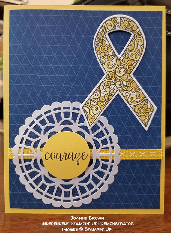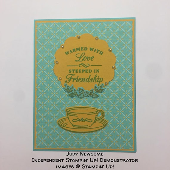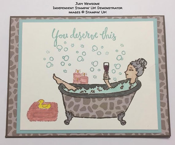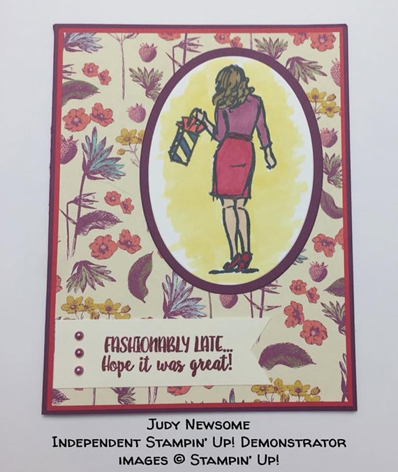 Judy Newsome made all the cards in today’s post. She’s a member of my Candy Hearts team of Demonstrators, and she lives in LaFayette, Georgia. By the way, in Walker County, GA, it’s pronounced la-FAY-it instead of LAH-fay-YET. You may notice that most of Judy’s cards (12 of the 16) have ribbon or twine. She’s an amazing seamstress and her love of fabric and trims spills over into her amazing card making.