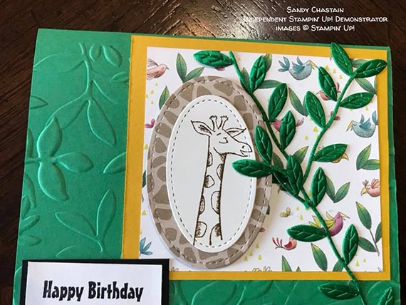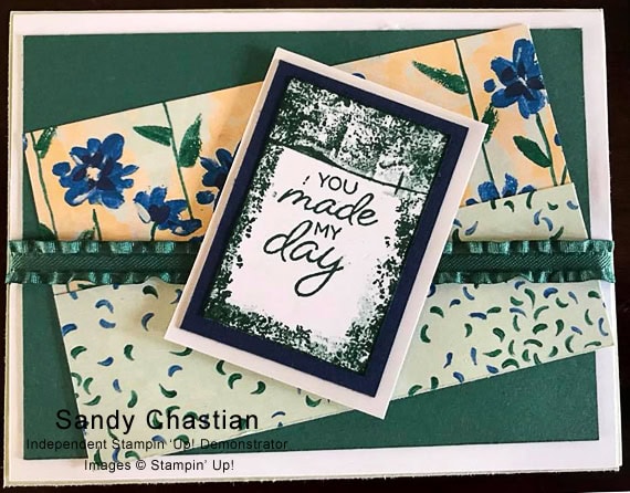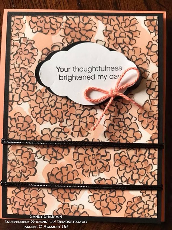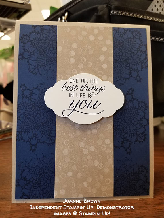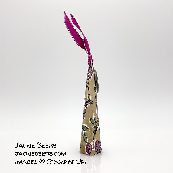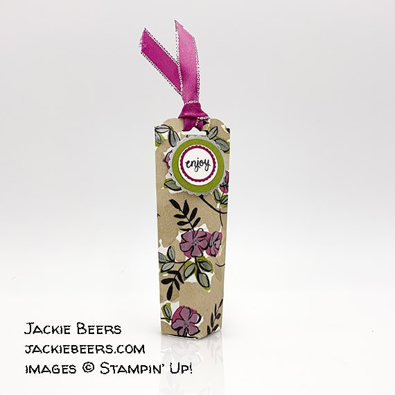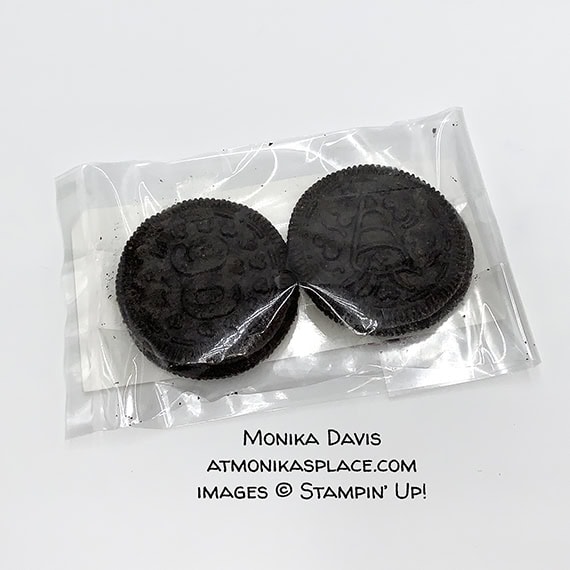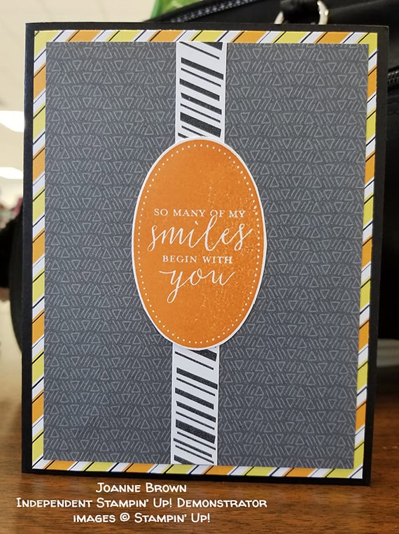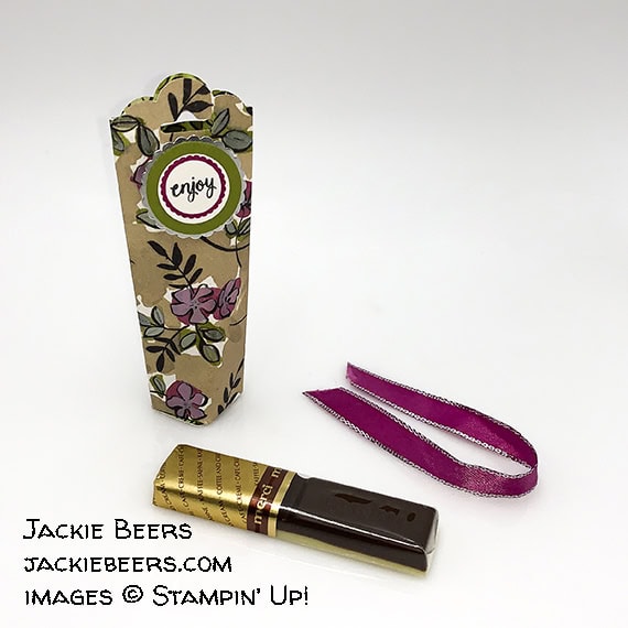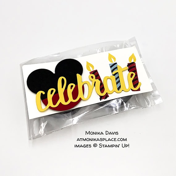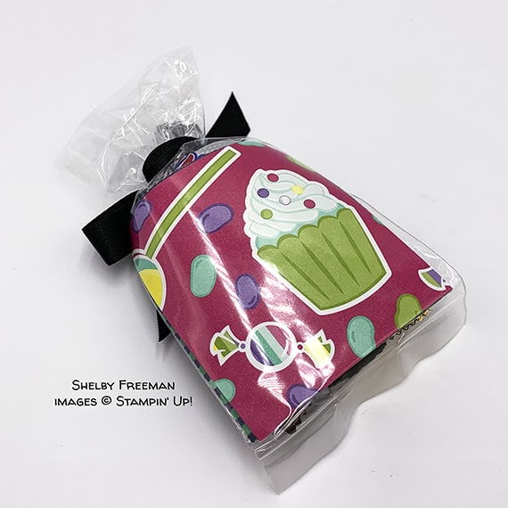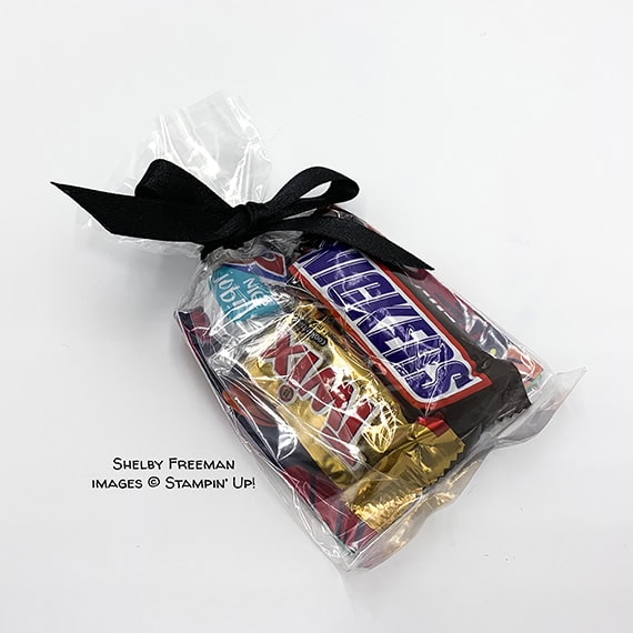 Shelby works for Stampin’ Up! in Utah – she’s my Business Development Advisor. I was happy to get to see her in person in Orlando! She put some candies along with some samples of brand new Designer Series Papers in a 3″ x 6″ Cello Bag and tied it with a piece of Basic Black satin ribbon.